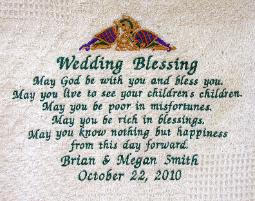 | Celtic Crests offers this 100% Cotton Throw, beautifully Embroidered with the Book of Kells Doves and the Irish Wedding Blessing and Personalized with the Bride and Groom's Names and Wedding Date. |
